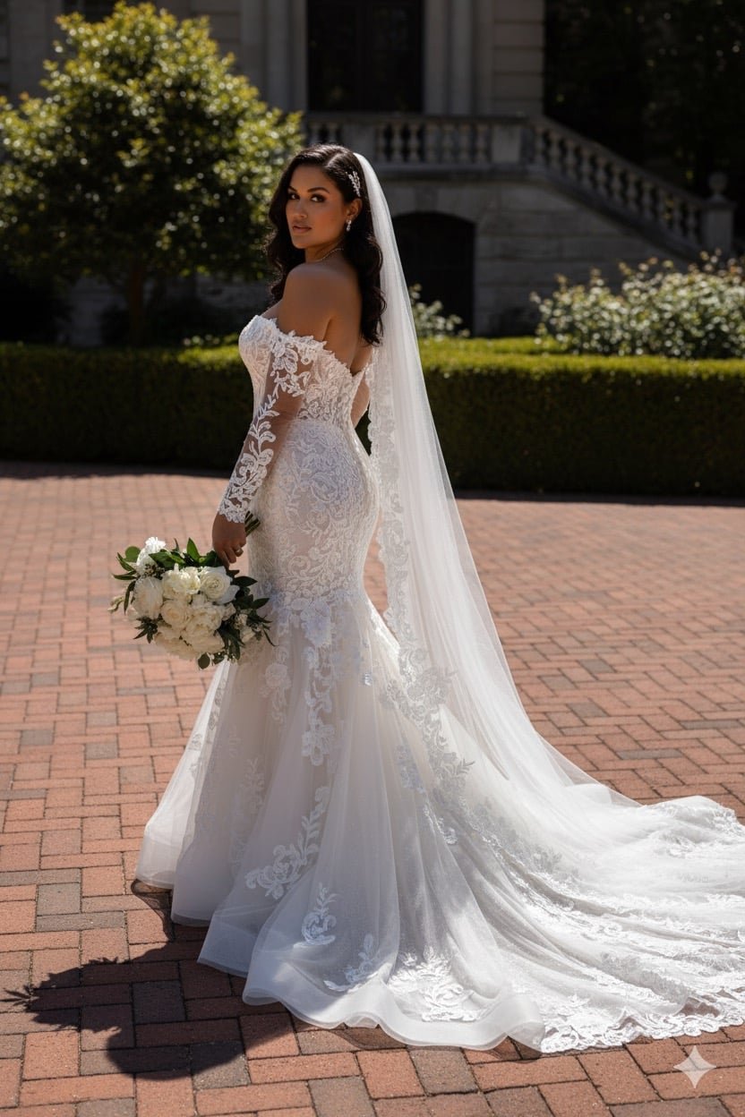 Decote e Mangas: O decote é ombro a ombro (ou “ciganinha”), conferindo um ar romântico e sensual. As mangas compridas são feitas de um tule transparente, ricamente adornadas com apliques de renda floral que se estendem pelos braços.
