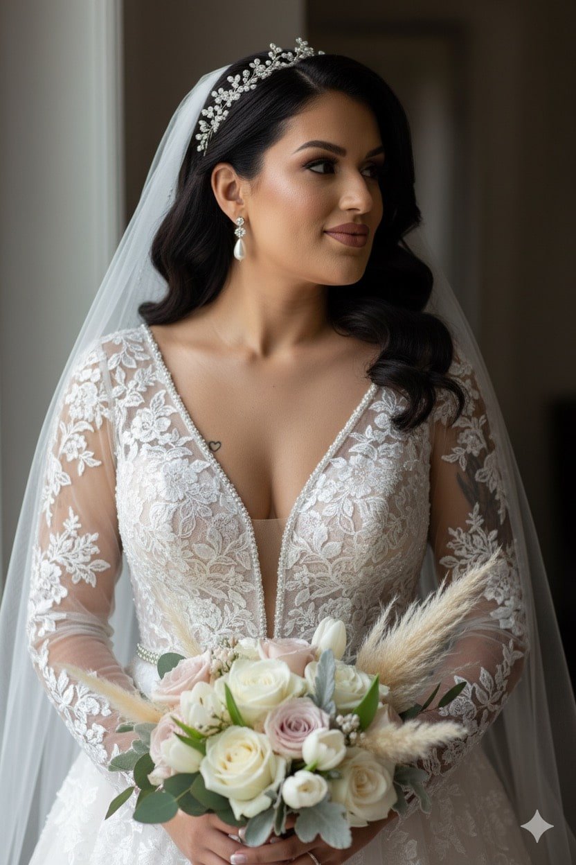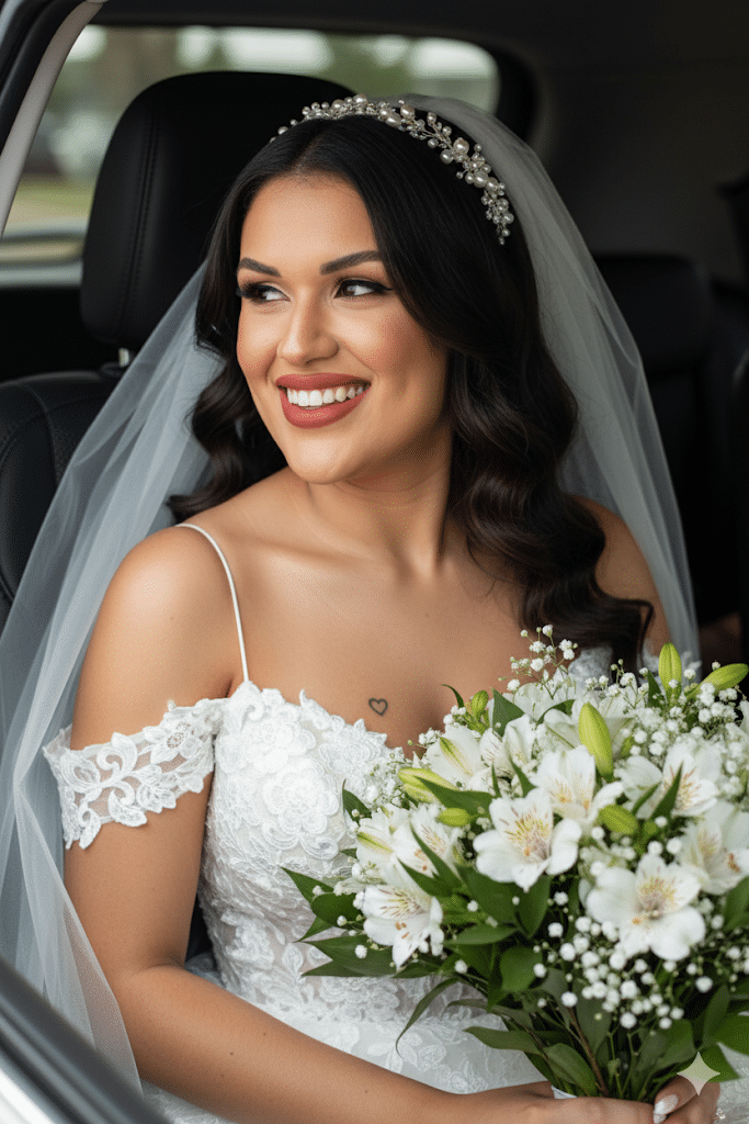 Seu cabelo é estilizado em ondas soltas e elegantes que caem sobre seus ombros. No topo da cabeça, um delicado acessório de noiva, possivelmente uma tiara ou presilha com pérolas ou cristais, prende um véu de tule branco e translúcido que desce suavemente por suas costas.