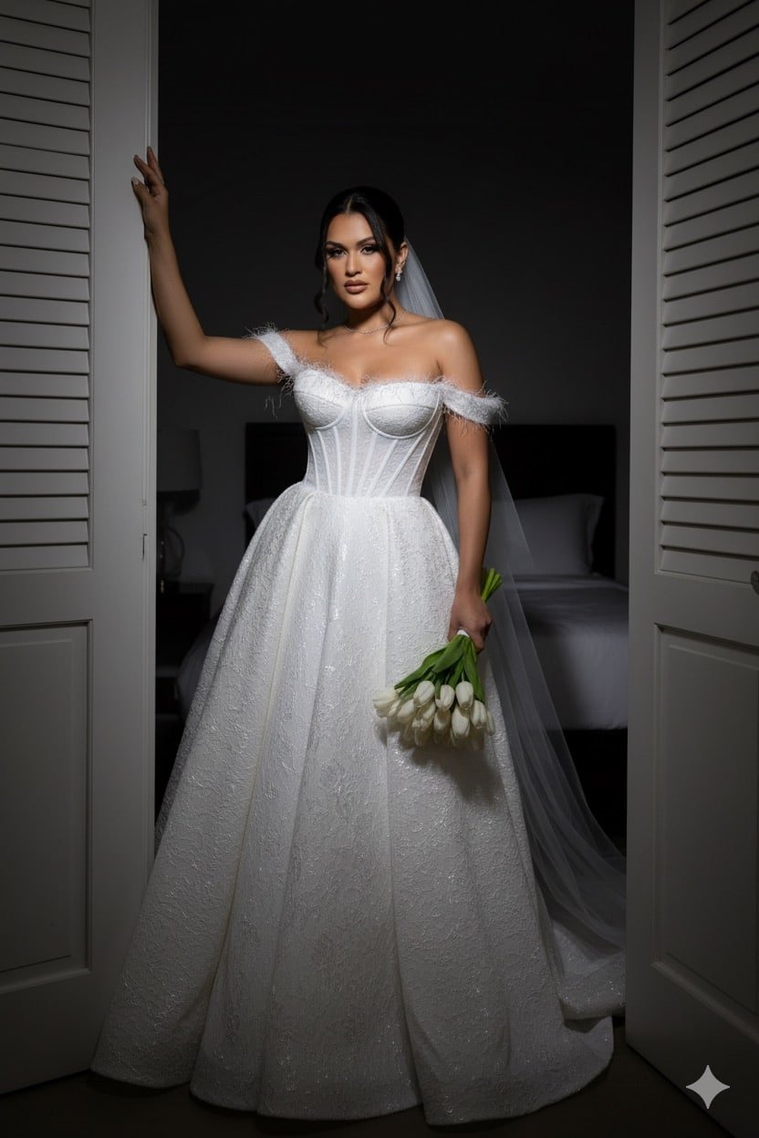 O Vestido: O vestido de noiva é primoroso e rico em detalhes. O design apresenta um decote ombro a ombro, com mangas curtas e caídas que deixam os ombros e a clavícula à mostra. O tecido do corpete e das mangas é inteiramente coberto por um bordado complexo, que parece ser uma combinação de renda e aplicações de lantejoulas ou miçangas, conferindo uma textura luxuosa e um brilho sutil à peça.