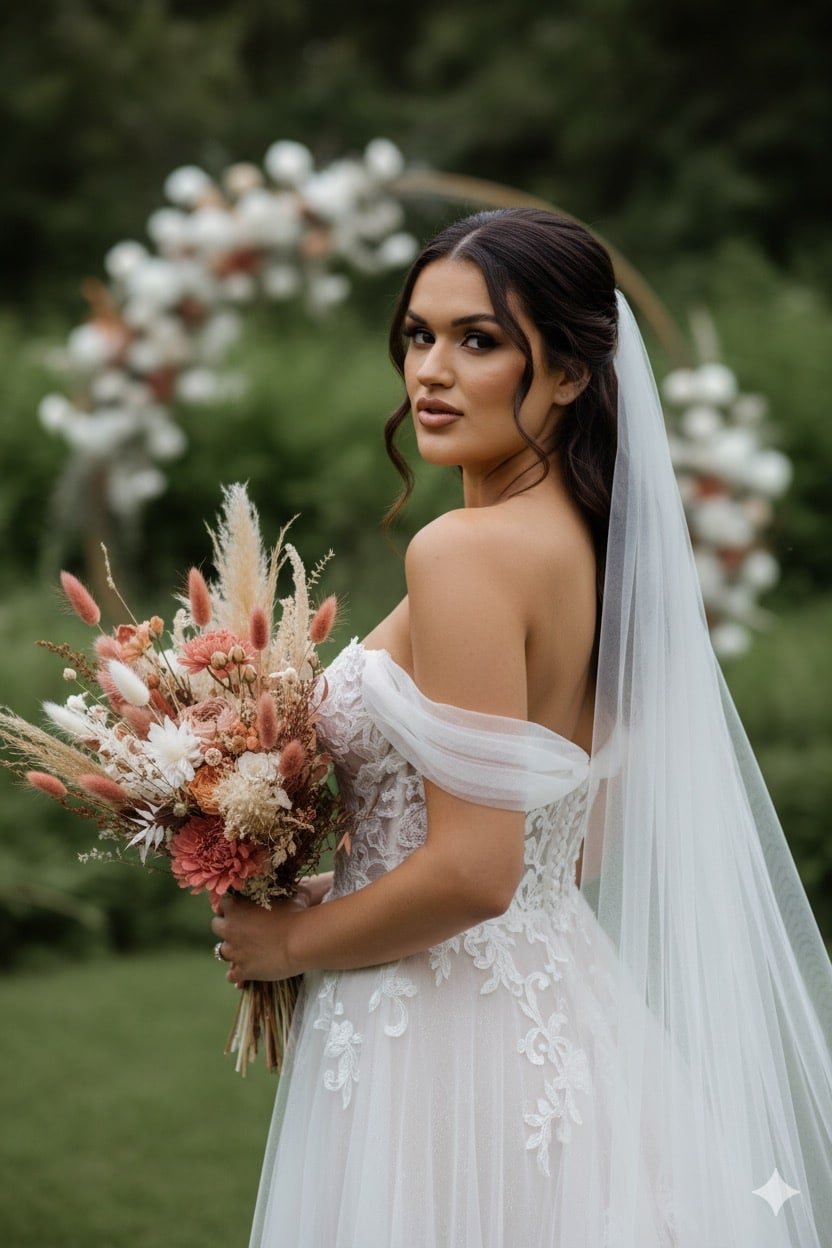 Ela segura um buquê notavelmente único e texturizado, de estilo rústico ou “boho”. Em vez de flores frescas tradicionais, ele é composto majoritariamente por flores secas e desidratadas, capins e folhagens. A paleta de cores do arranjo é quente e terrosa, incluindo: