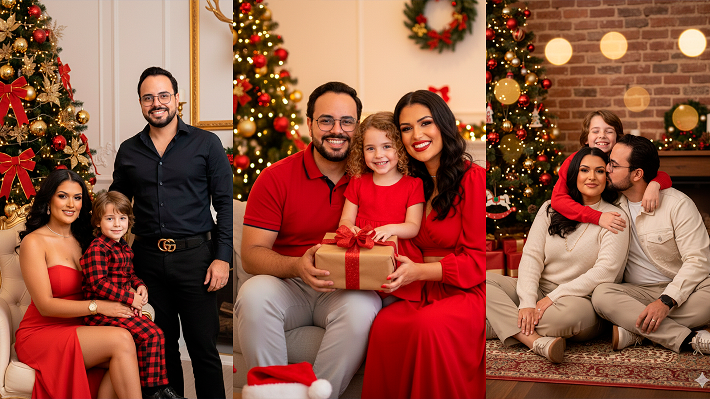 Iluminação: A iluminação é suave e profissional, destacando os tons de pele e as cores vibrantes do vermelho natalino. foto natural, visão realista, sem edição, estética de celular, tirada do iPhone 13. Fotografia de lifestyle.