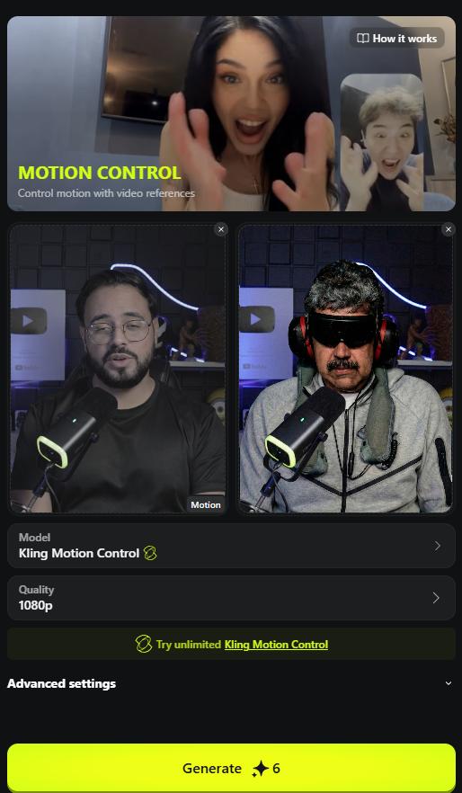 Acesse o painel do Higgsfield. Na área de criação, certifique-se de selecionar o modelo Kling 2.6 (ou 1.5). É crucial ativar a chave “Motion Control” nas configurações do modelo. Sem isso, a mágica não acontece.